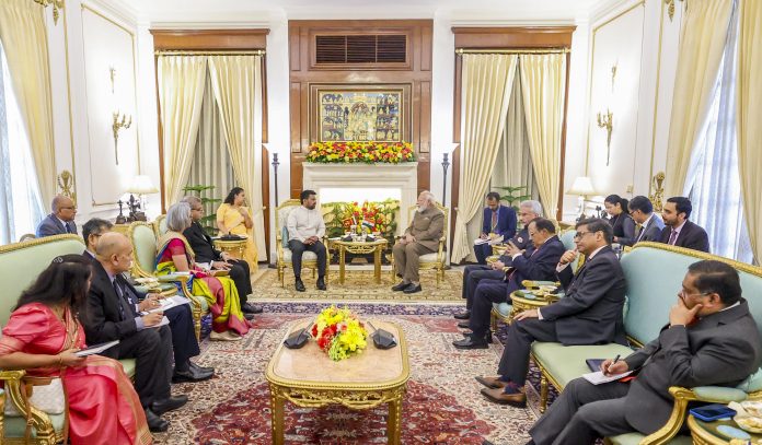 **EDS: THIRD PARTY IMAGE** In this image received on Feb. 20, 2026, Prime Minister Narendra Modi during a meeting with Sri Lankan President Anura Kumara Dissanayake at Hyderabad House, in New Delhi. (PMO via PTI Photo)(PTI02_20_2026_000195B)