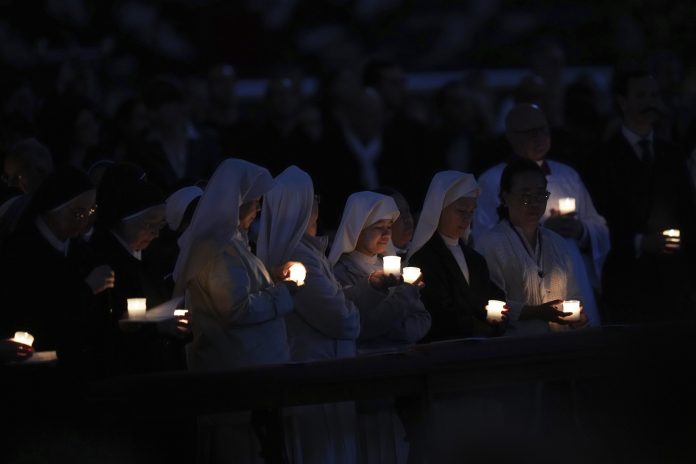 Nuns hold candles as Dean of the College of Cardinals Giovanni Battista Re leads the Easter vigil inside St. Peter's Basilica at the Vatican, Saturday, April 19, 2025. AP/PTI(AP04_19_2025_000619I)