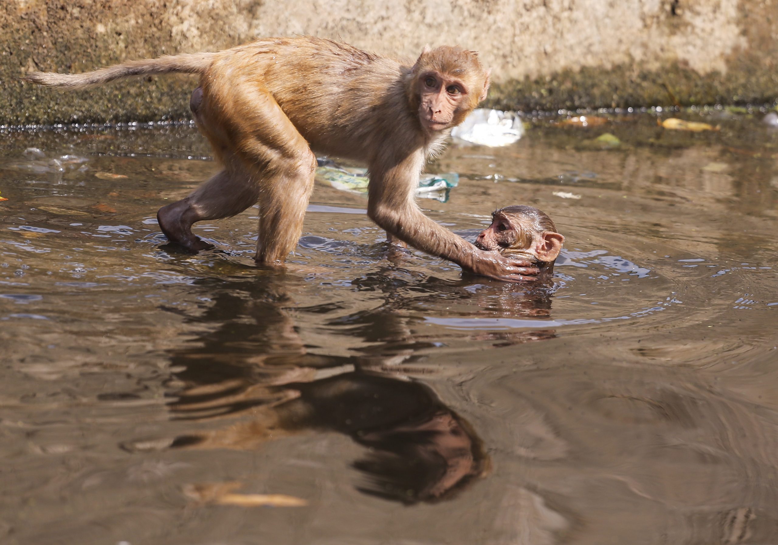 SEO Tags: National, Standalone: Monkeys in a pond in Prayagraj, PTI03_29_2026_000372B.jpg, #swadesi #photonews