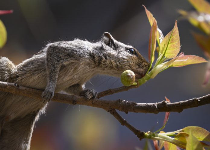 New Delhi: A squirrel feeds on a flower bud while perching on a tree branch on a sunny day, in New Delhi, Wednesday, March 25, 2026. (PTI Photo/Kamal Kishore) (PTI03_25_2026_000083B)