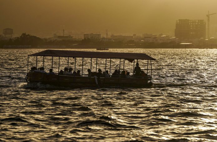 Ajmer: Tourists take a boat ride during sunset at the Ana Sagar Lake, in Ajmer, Rajasthan, Sunday, March 29, 2026. (PTI Photo) (PTI03_29_2026_000398B)