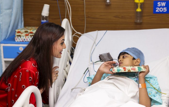 Hyderabad: A Miss World 2025 contestant presents a gift to a young patient, during a visit to AIG hospital, in Hyderabad, Telangana, Friday, May 16, 2025. (PTI Photo) (PTI05_16_2025_000188B)