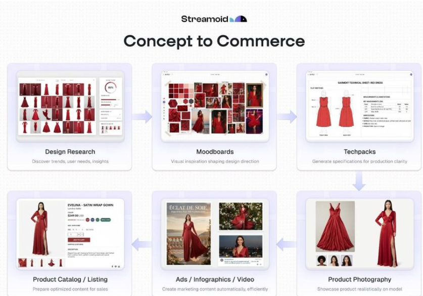 Artifax (Design Intelligence) turns trend and sales signals into concept boards and factory-ready tech packs, compressing design cycles from ideation to specs. Photogenix (Studio OS, Ads & Video) orchestrates shoots, enforces brand guidelines and generates on-model and lifestyle imagery and short-form video, reducing production overhead even for difficult categories such as kidswear. Catalogix (Product Data & Listings) ingests information from internal systems and approved external sources, enriches product content with Streamoid’s proprietary AI, and publishes consistent listings across any channel.