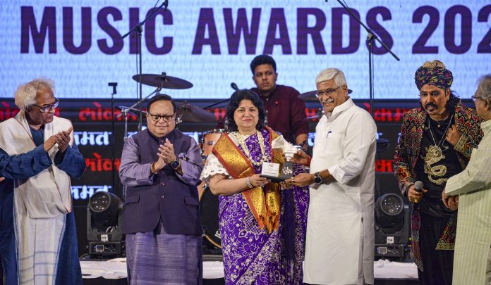 New Delhi: Union Minister of Culture and Tourism Gajendra Singh Shekhawat and Lokmat Media Group Chairman Vijay Darda present the ‘Icon Award’ to classical singer Anita Singhvi during the Sur Jyotsna National Music Awards (SJNMA), in New Delhi, Saturday, April 12, 2025. (PTI Photo) (PTI04_12_2025_000545B)