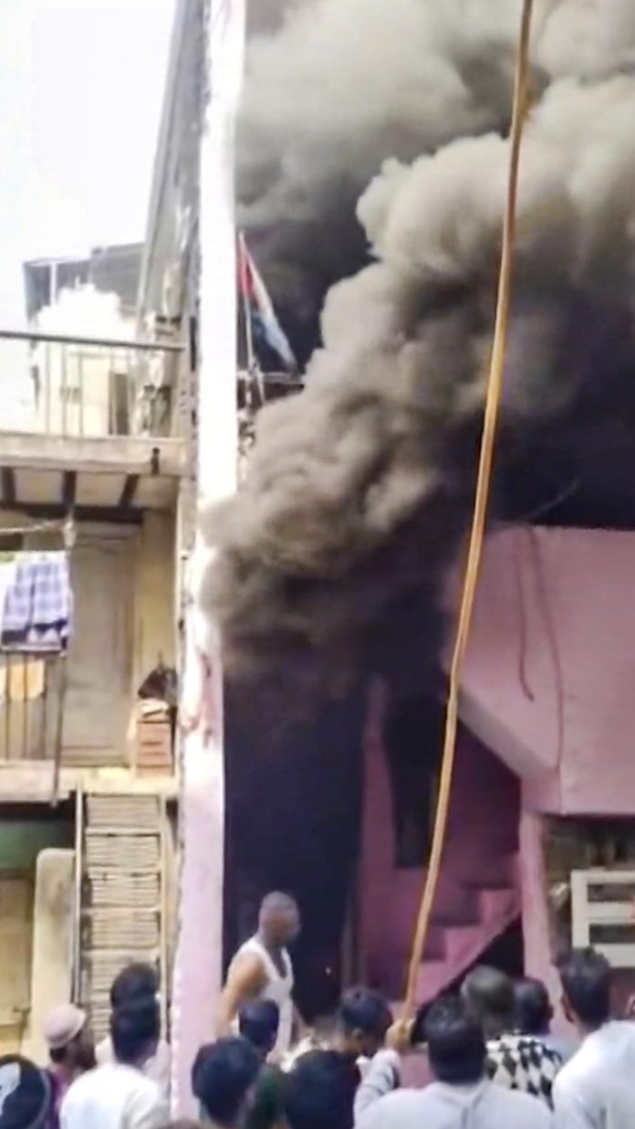 Surat: People gather as thick smoke billows from a house following a fire incident, in Surat, Tuesday, March 31, 2026. Four women and a child died in the blaze, reportedly triggered by an electrical spark amid highly inflammable saree packing materials. (PTI Photo)(PTI03_31_2026_000205B)