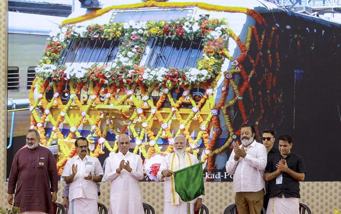 Kochi: Prime Minister Narendra Modi flags off the Palakkad-Pollachi train during the inauguration of various development projects, in Kochi, Wednesday, March 11, 2026. BJP state president Rajeev Chandrasekhar, Union Ministers George Kurian and Suresh Gopi, Kerala Governor Rajendra Vishwanath Arlekar, and Ernakulam MP Hibi Eden are also seen. (PTI Photo)(PTI03_11_2026_000321B)
