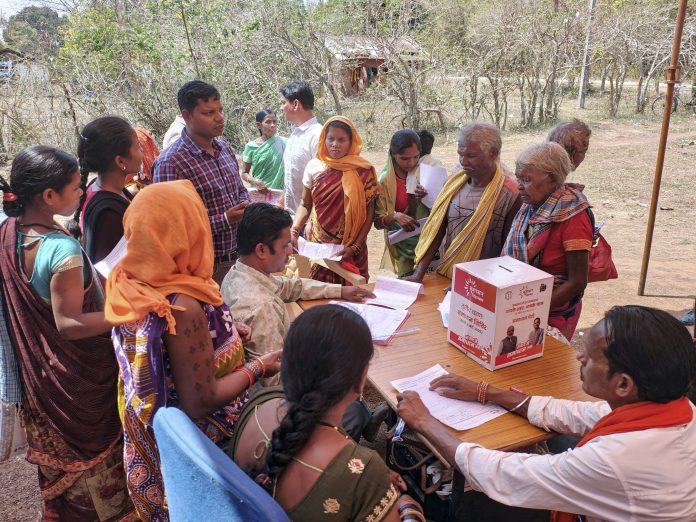 Bastar: People gather to submit applications regarding their problems in a ‘Solution Box’, made available under the ‘Sushasan Tihar 2025’ campaign launched by Chhattisgarh Government for quick resolution of public problems in the state, on the outskirts of Jagdalpur, in Bastar district, Tuesday, April 8, 2025. (PTI Photo)(PTI04_08_2025_000478B)