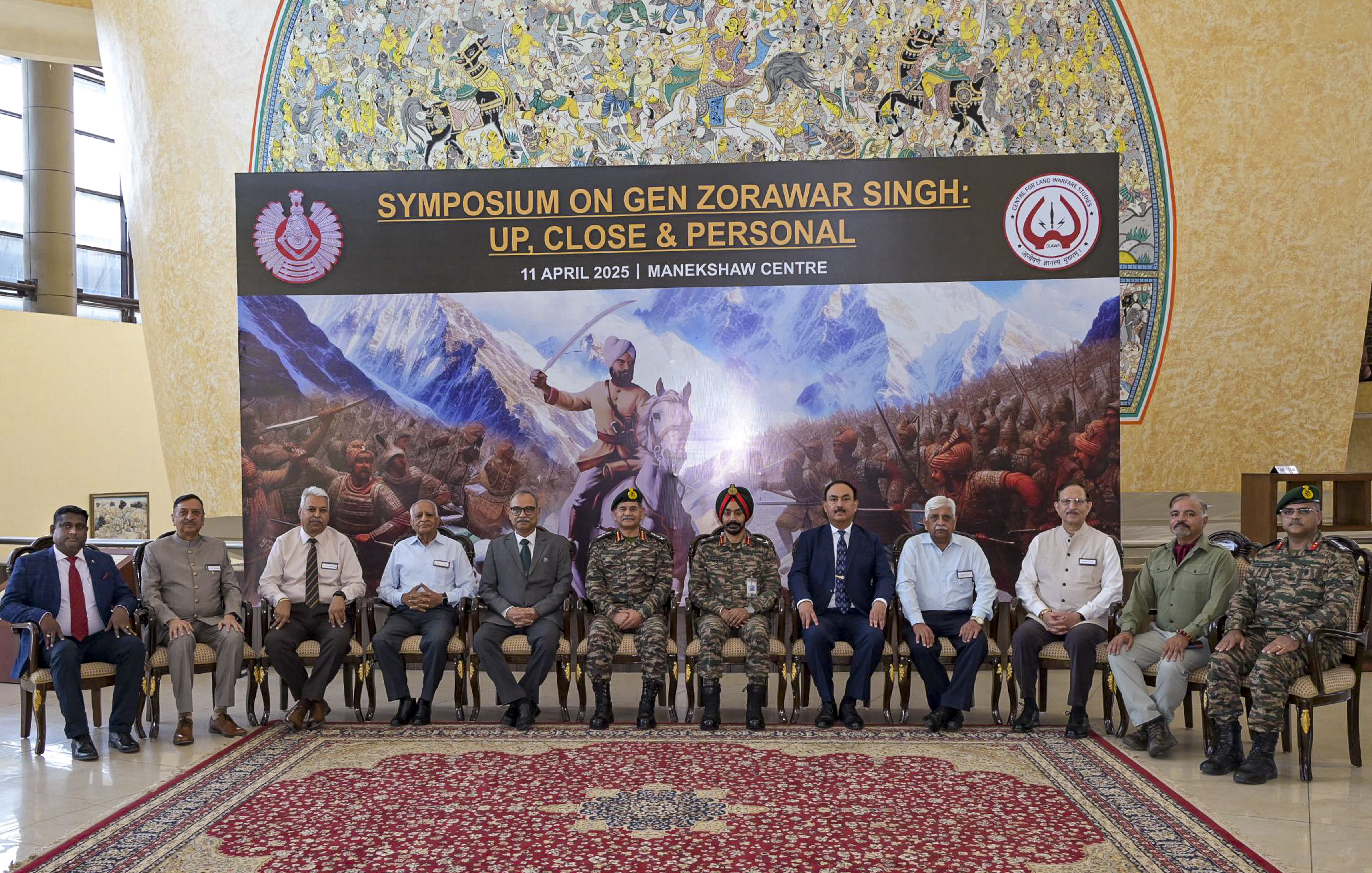 **EDS: THIRD PARTY IMAGE; TO GO WITH STORY** In this handout image released by the Indian Army on April 11, 2025, Chief of the Army Staff General Upendra Dwivedi and others during a symposium on General Zorawar Singh’s life and legacy, hosted by the Jammu and Kashmir Rifles regiment and CLAWS at Manekshaw Centre, in New Delhi. (Indian Army via PTI Photo)