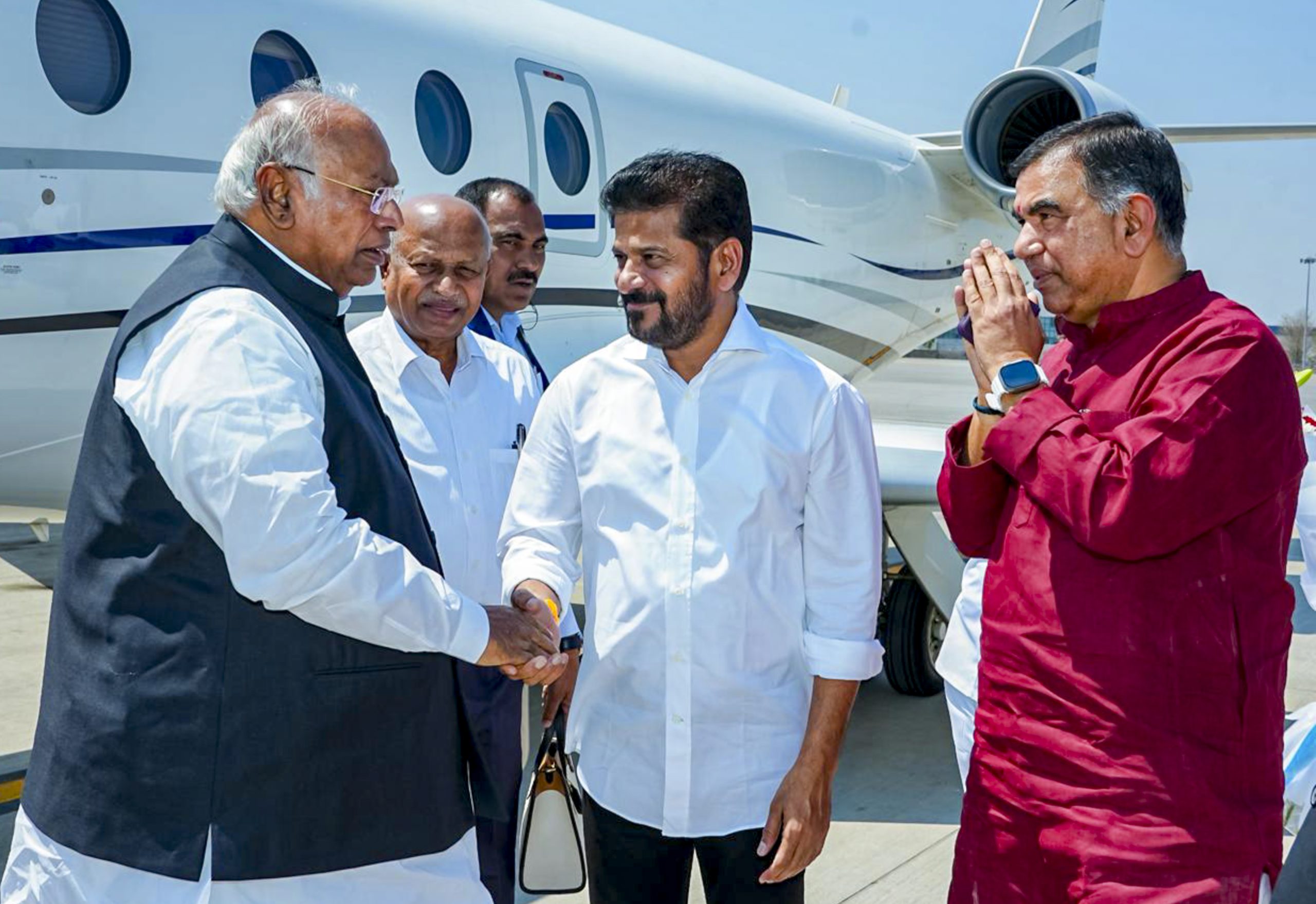 **EDS: THIRD PARTY IMAGE** In this image posted on March 5, 2026, Congress President Mallikarjun Kharge being received by Telangana Chief Minister Revanth Reddy on his arrival, in Hyderabad. (@revanth_anumula/X via PTI Photo) (PTI03_05_2026_000124B)