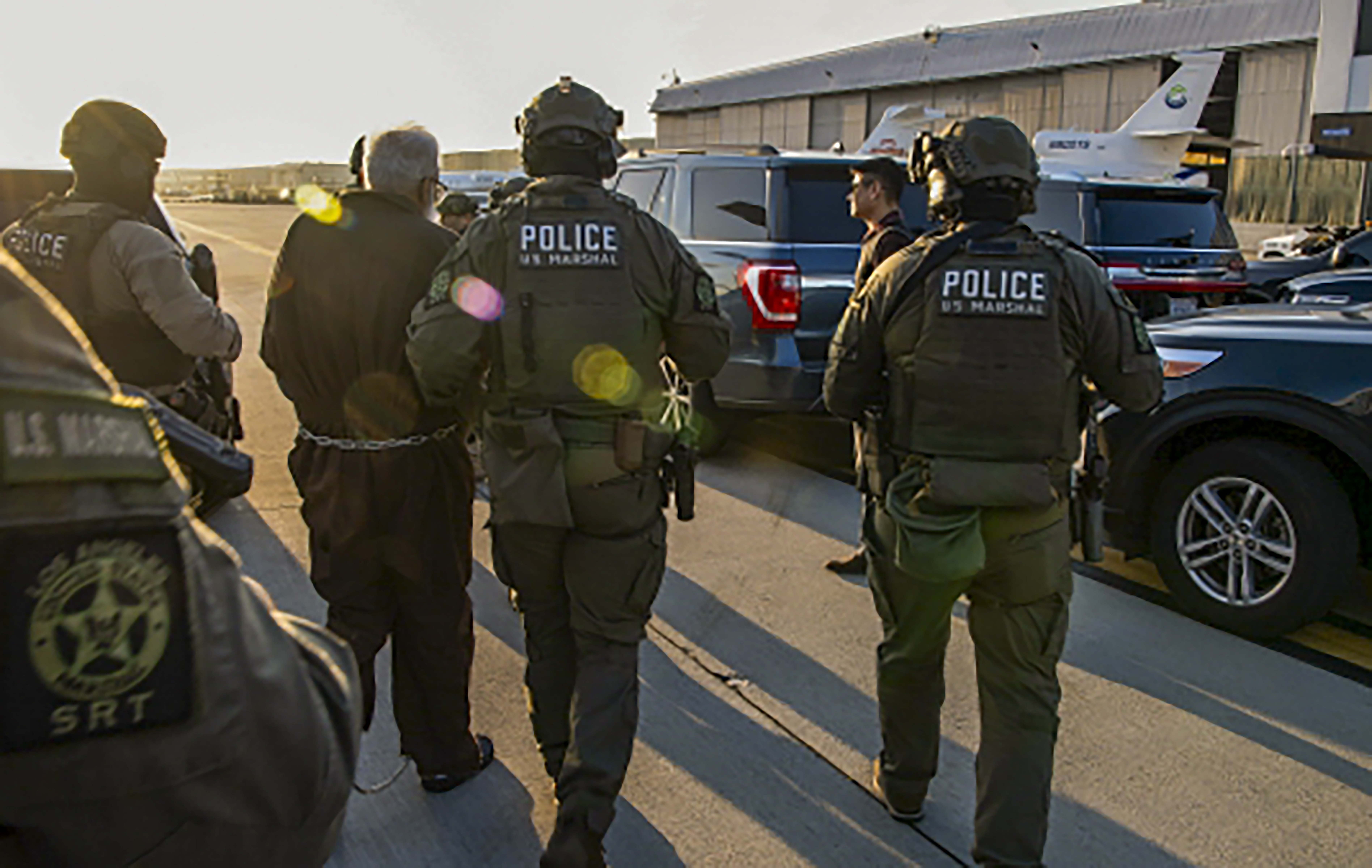 **EDS: THIRD PARTY IMAGE** In this image released by www.justice.gov on Tuesday, April 9, 2025, U.S. Marshals transfer the custody of Tahawwur Hussain Rana, a key accused in the 26/11 Mumbai terror attacks, to the NIA team, in California, US. (U.S. Marshals Service/Shane T. McCoy via PTI Photo) (PTI04_11_2025_000143B)