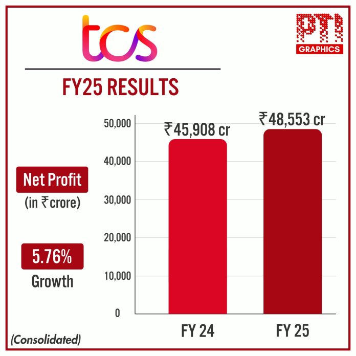 TCS FY25 Results PTI INFOGRAPHICS | TCS net profit dips 1.68 pc to Rs 12,224 crore in March quarter. PTI GRAPHICS.(PTI04_10_2025_001010002B)