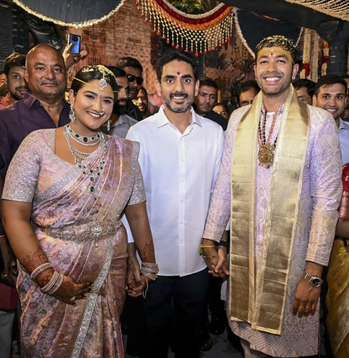 **EDS: THIRD PARTY IMAGE; SPECIAL PACKAGE** In this image received on March 25, 2026, Andhra Pradesh Minister Nara Lokesh attends the wedding ceremony of Telugu Desam Party (TDP) MLA Dhulipalla Narendra Kumar’s daughter Naga Sai Vydeepthi with Kevin Ram, in Guntur. (Handout via PTI Photo) (PTI03_25_2026_000427B) *** Local Caption ***