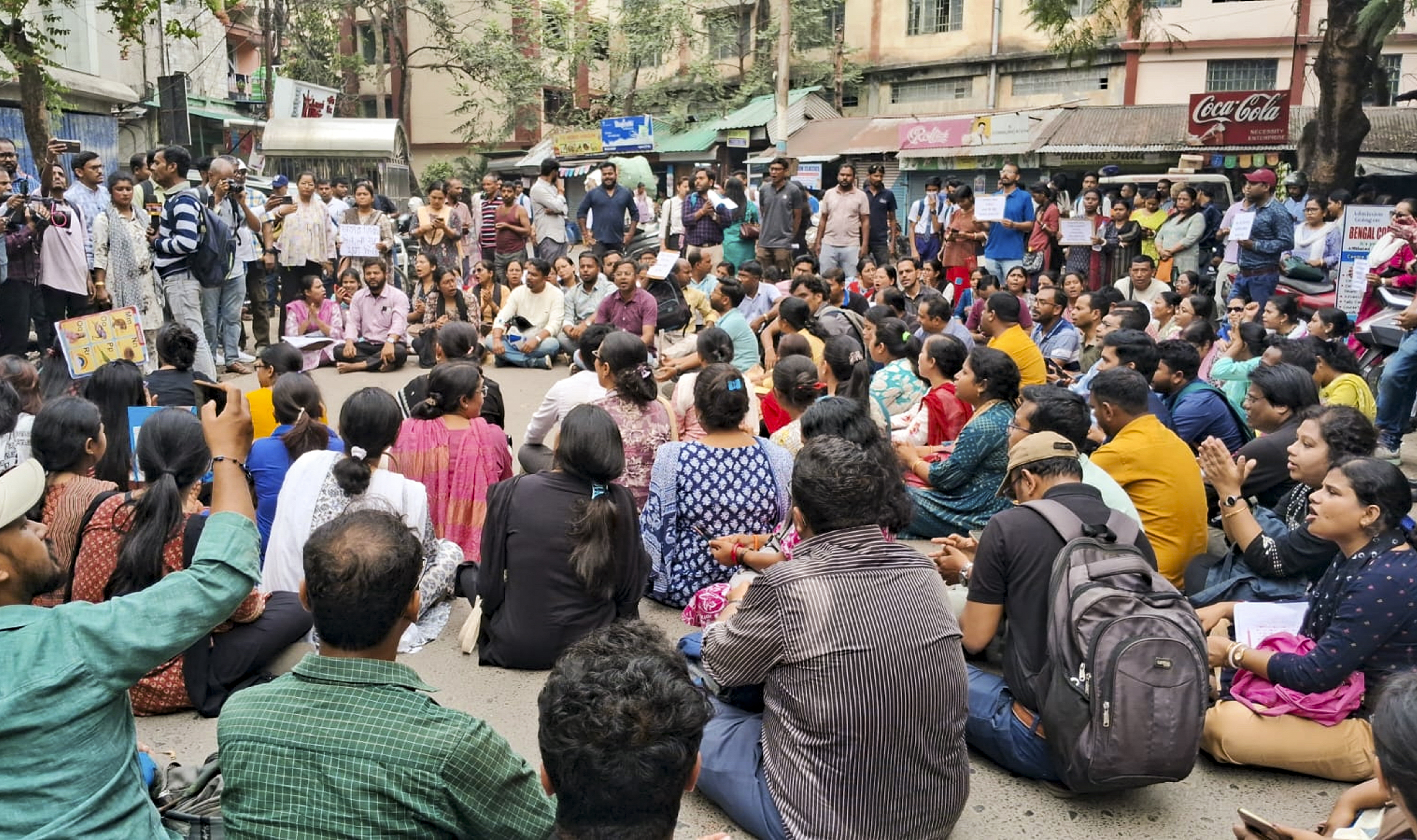 Siliguri: School teachers protest at the office of the District Inspector of Schools over loss of school job issue, in Siliguri, Wednesday, April 9, 2025. Several districts of West Bengal witnessed widespread protests on Wednesday as a section of teachers and non-teaching staffers, who lost their jobs following a Supreme Court verdict that invalidated their appointments, clashed with police during demonstrations. (PTI Photo) (PTI04_09_2025_000635B)