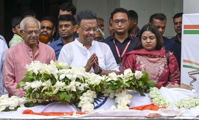 Kolkata: West Bengal Urban Development and Municipal Affairs Minister Firhad Hakim, centre, and West Bengal Minister Sovandeb Chattopadhayay pay their last respects to former Minister and veteran leader Abdur Razzak Molla in Kolkata, Saturday, April 12, 2025. Mollah passed away at his ancestral home in South 24 Parganas, Friday morning. (PTI Photo) (PTI04_12_2025_000072B)