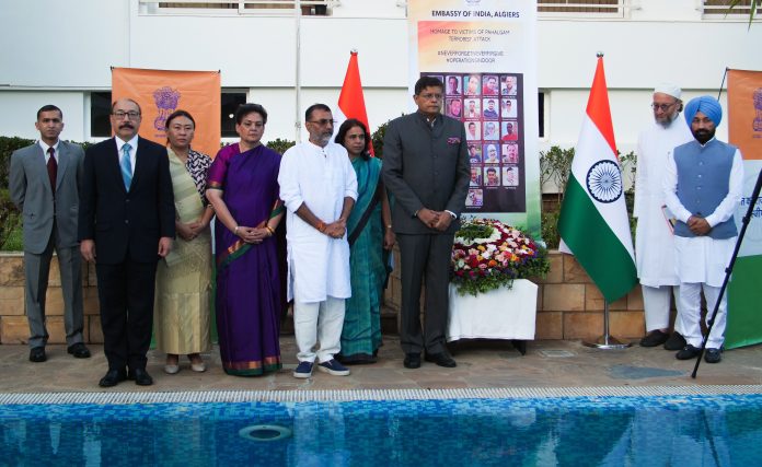 **EDS: RPT, CORRECTS TYPOS (THIRD PARTY IMAGE)** In this image via X/@indiainalgeria on Sunday, June 1, 2025, an all-party parliamentary delegation, led by BJP MP Baijayant Jay Panda, observes silence for the victims of Pahalgam terror attack after briefing the Algerian media, think tank members, the Indian diaspora, and friends of India in Algeria. A minute of silence was observed in tribute to the victims of the Pahalgam terrorist attack. (X/@IndiaInAlgeria via PTI Photo) (PTI06_01_2025_RPT022B) *** Local Caption ***