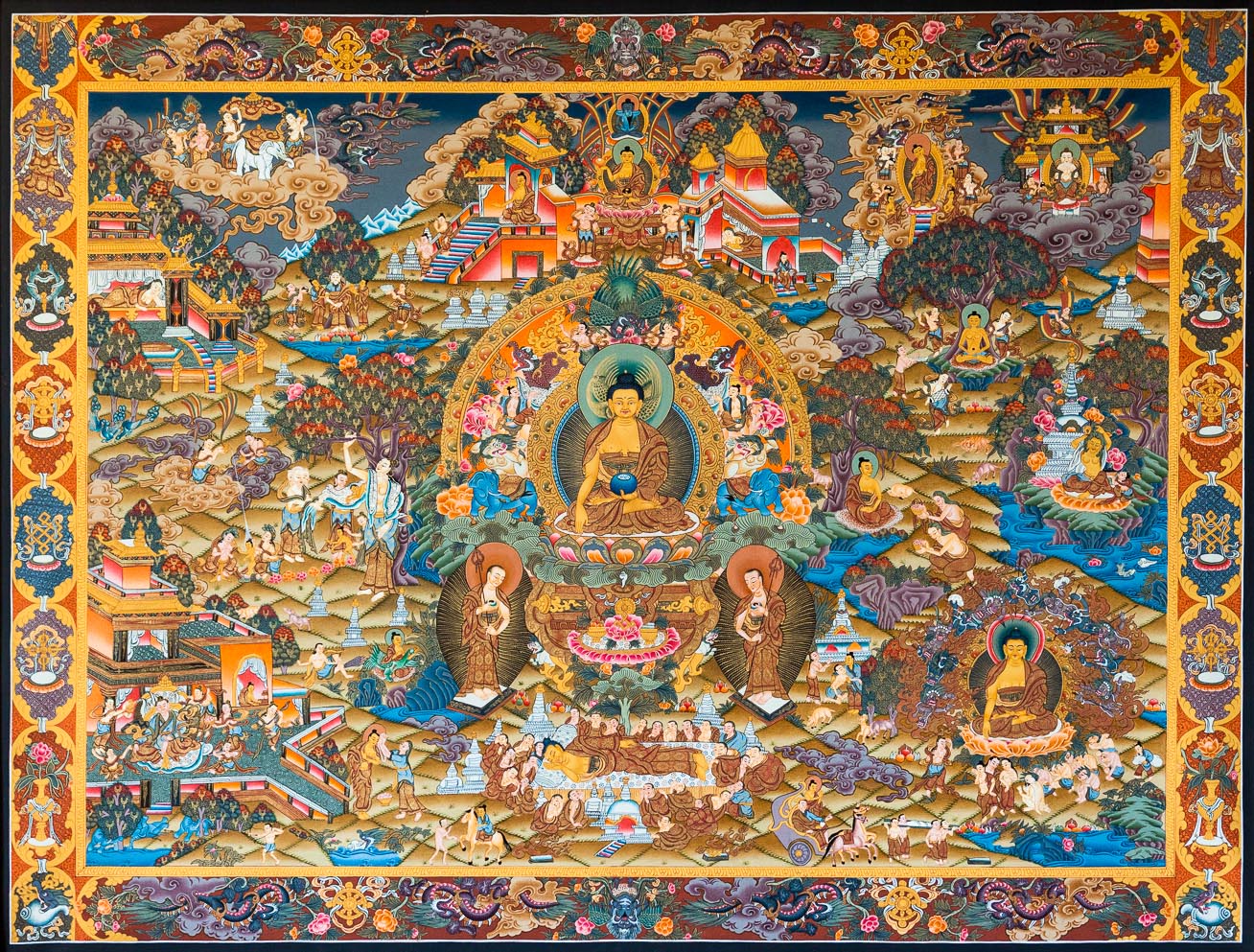 They often have some story to narrate through elaborative compositions of many very small figures. A central Buddhist deity is often surrounded by other identified figures in a symmetrical composition.