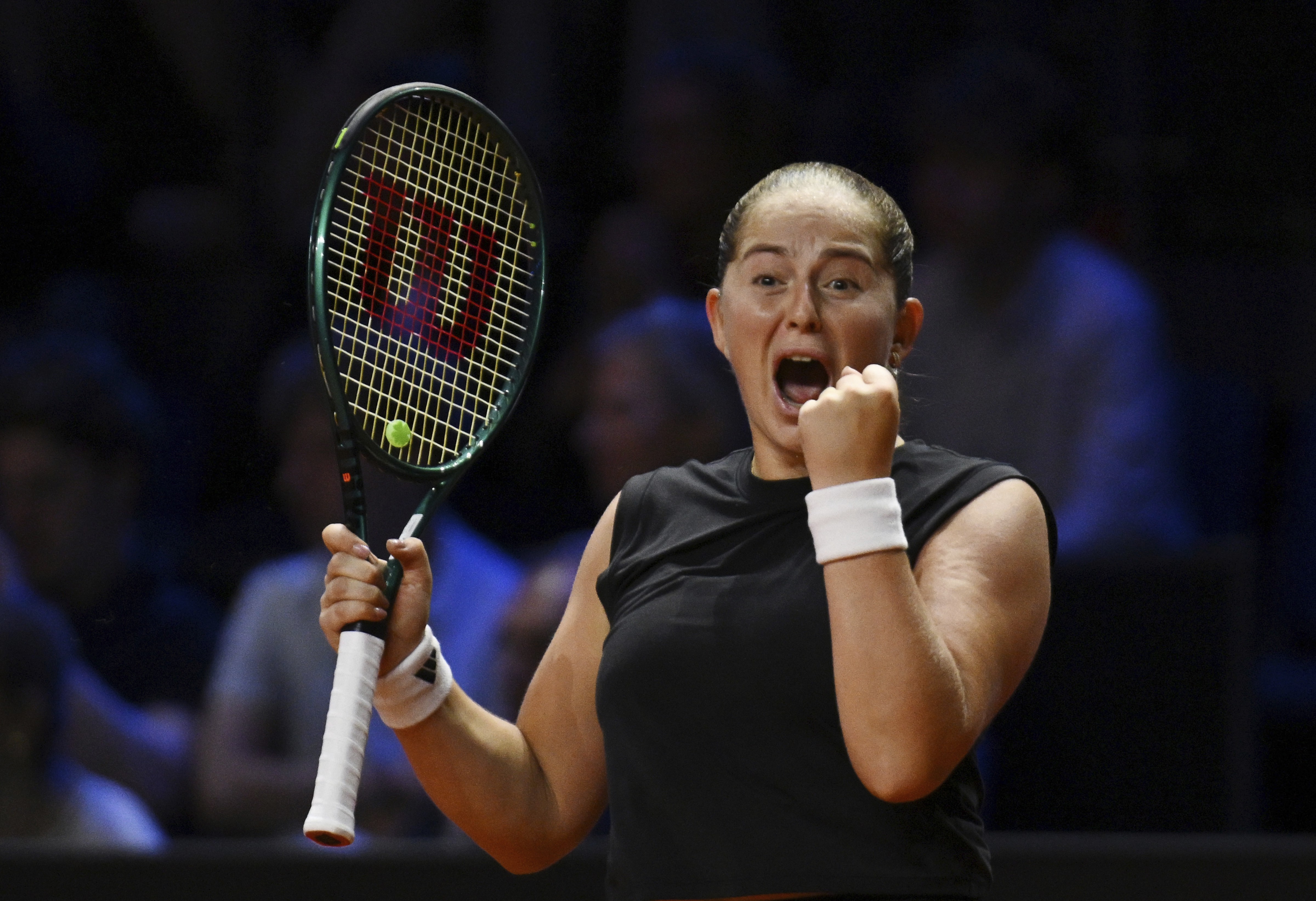 Latvia's Jelena Ostapenko reacts after her victory following the women's singles final tennis match of the WTA tour, in Stuttgart, Germany, Monday, April 21, 2025. AP/PTI(AP04_21_2025_000348B)