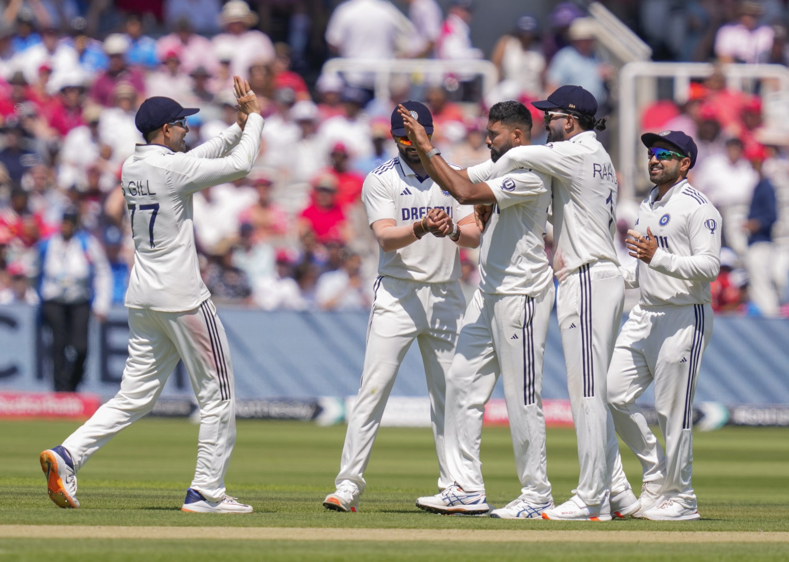 London: India's Mohammed Siraj celebrates with teammates after taking the wicket of England's Jamie Smith on the second day of the third test cricket match between India and England, at the Lord's Cricket Ground, in London, Friday, July 11, 2025. (PTI Photo/R Senthilkumar) (PTI07_11_2025_000267B)