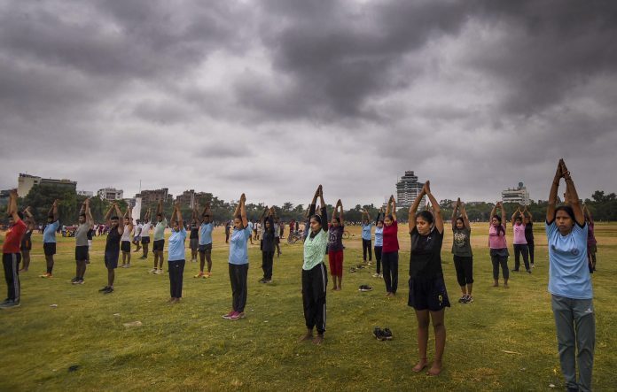 **EDS: RPT CORRECTS DATELINE** Patna: People take part in a yoga session as dark clouds hover in the sky, ahead of International Yoga Day, in Patna, Thursday, June 19, 2025. (PTI Photo) (PTI06_19_2025_RPT034B)