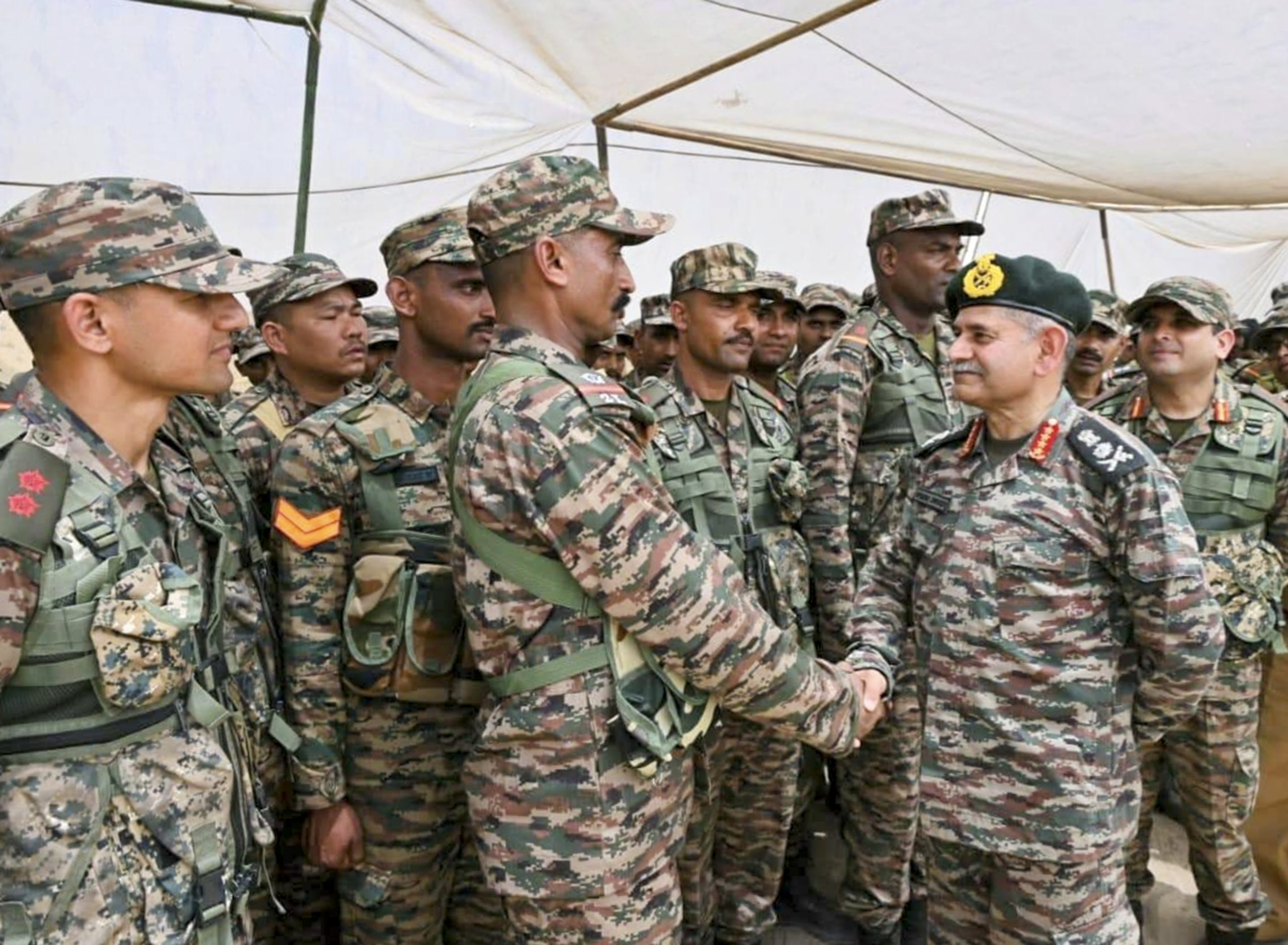 **EDS: THIRD PARTY IMAGE** In this image released by @adgpi via X on Monday, May 19, 2025, Army Chief General Upendra Dwivedi visits Laungewala in the forward areas of the Konark Corps in the desert sector to congratulate the troops for their exemplary role during Operation Sindoor and to review the joint actions undertaken in coordination with the Indian Air Force and the Border Security Force. (@adgpi via PTI Photo) (PTI05_19_2025_000264B) *** Local Caption ***