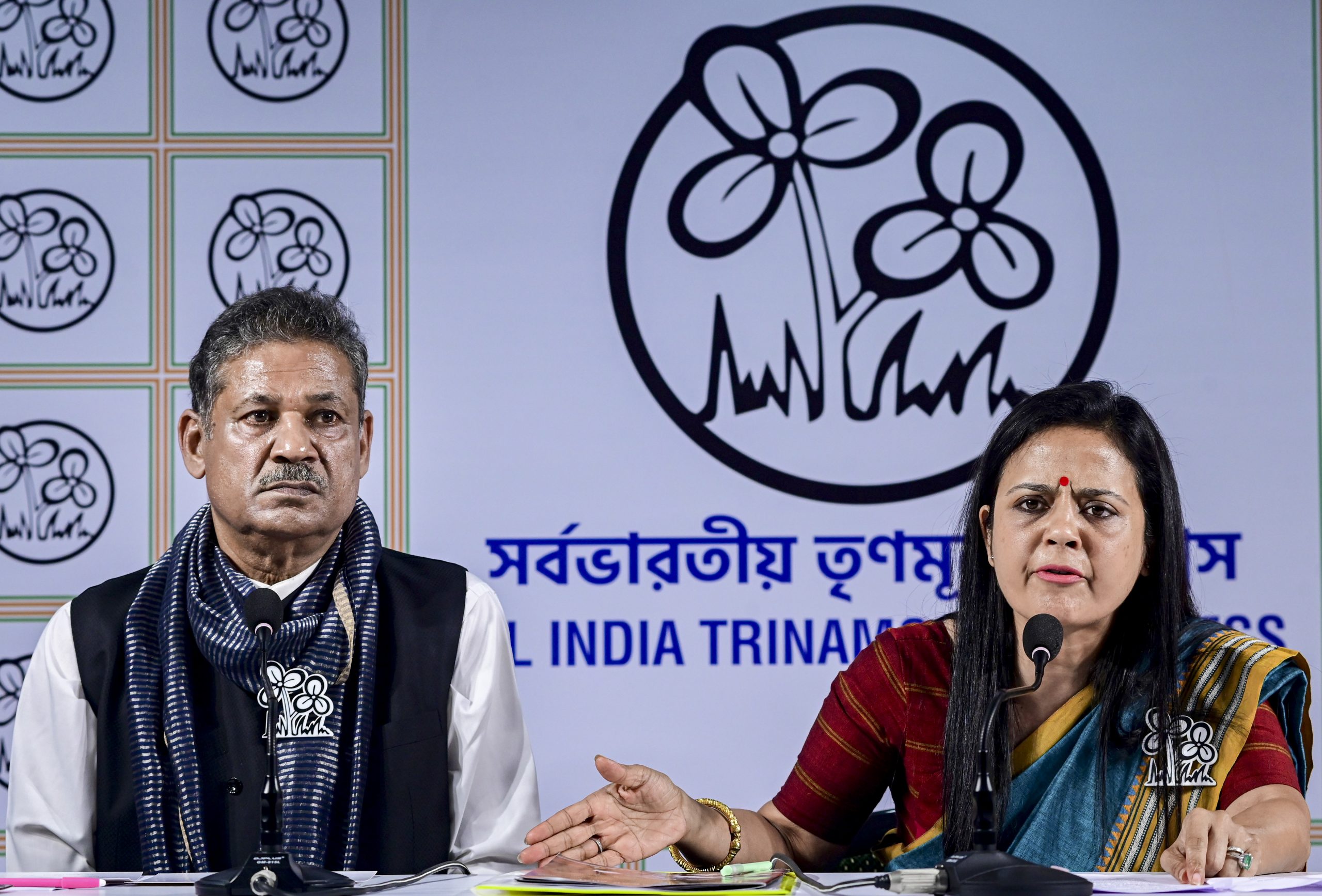Kolkata: Trinamool Congress (TMC) MPs Kirti Azad, left, and Mahua Moitra address a press conference after releasing ‘Chargesheet against BJP’, in Kolkata, Saturday, March 28, 2026. TMC slammed Union Home Minister Amit Shah on Saturday with a counter to his “chargesheet” against the Mamata Banerjee government, accusing the BJP of trying to polarise the people of poll-bound West Bengal and evade accountability for its own record on a host of issues, including women’s safety. (PTI Photo) (PTI03_28_2026_000316B)