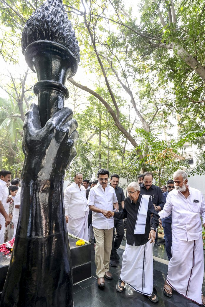 Chennai: Tamil Nadu Chief Minister MK Stalin during his 73rd birthday celebrations, in Chennai, Tamil Nadu, Sunday, Mar. 1, 2026. DMK MP TR Baalu is also seen. (PTI Photo)(PTI03_01_2026_000133B)