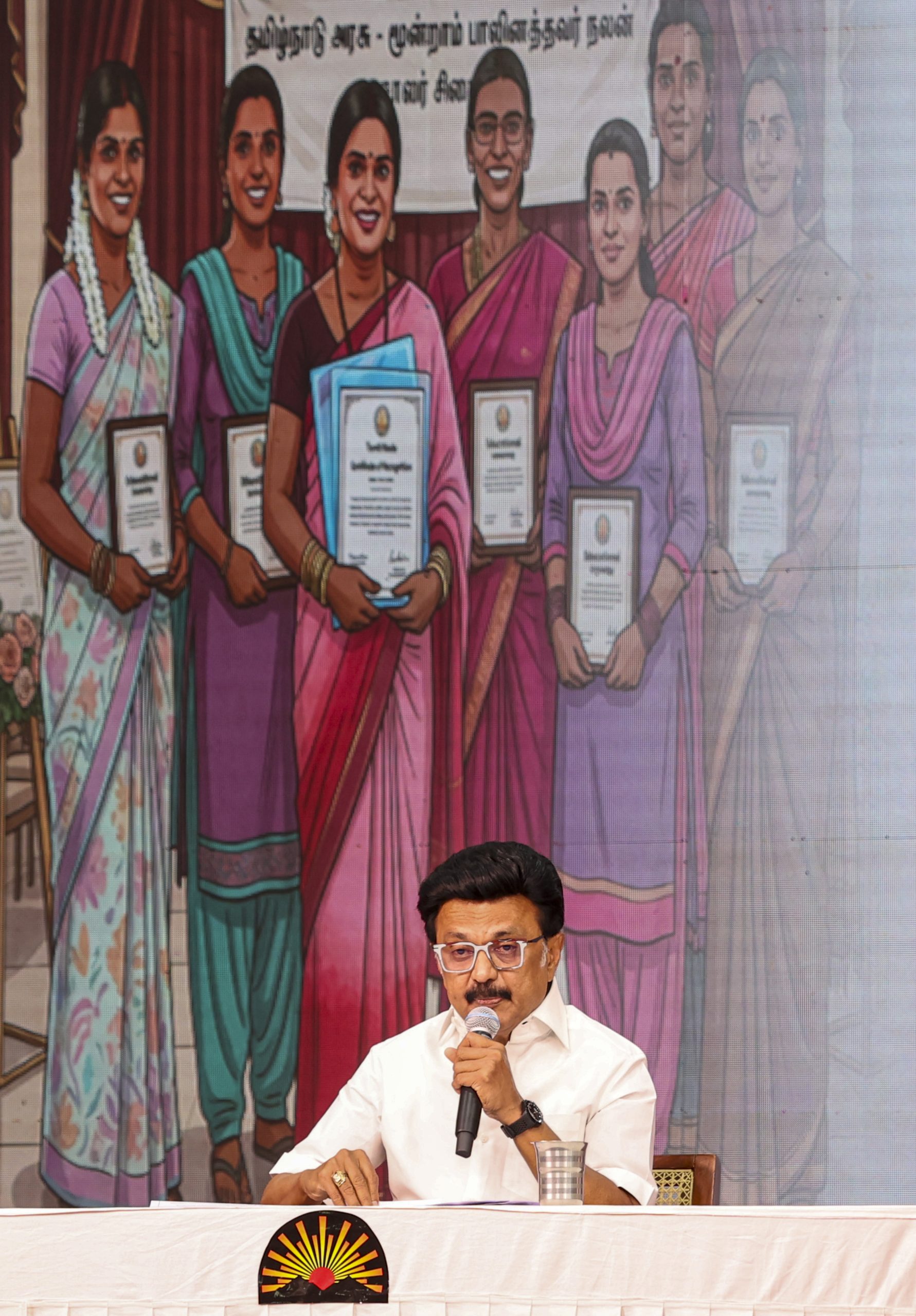 Chennai: DMK President and Tamil Nadu Chief Minister MK Stalin addresses the gathering during the release of the party’s manifesto for the upcoming state Assembly elections, at Anna Arivalayam, in Chennai, Sunday, March 29, 2026. (PTI Photo) (PTI03_29_2026_000348B)