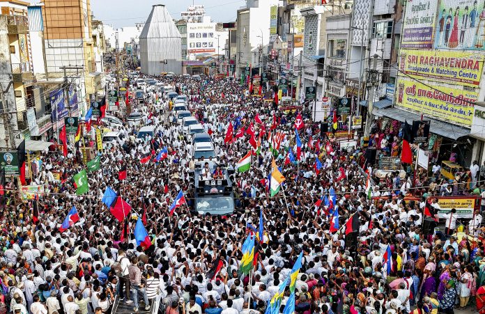 Kanchipuram: Tamil Nadu Deputy Chief Minister Udhayanidhi Stalin greets supporters during a roadshow in support of DMK candidate Nithya Sukumar, ahead of the state Assembly elections, in Kanchipuram, Monday, March 30, 2026. (PTI Photo) (PTI03_30_2026_000446B) *** Local Caption ***