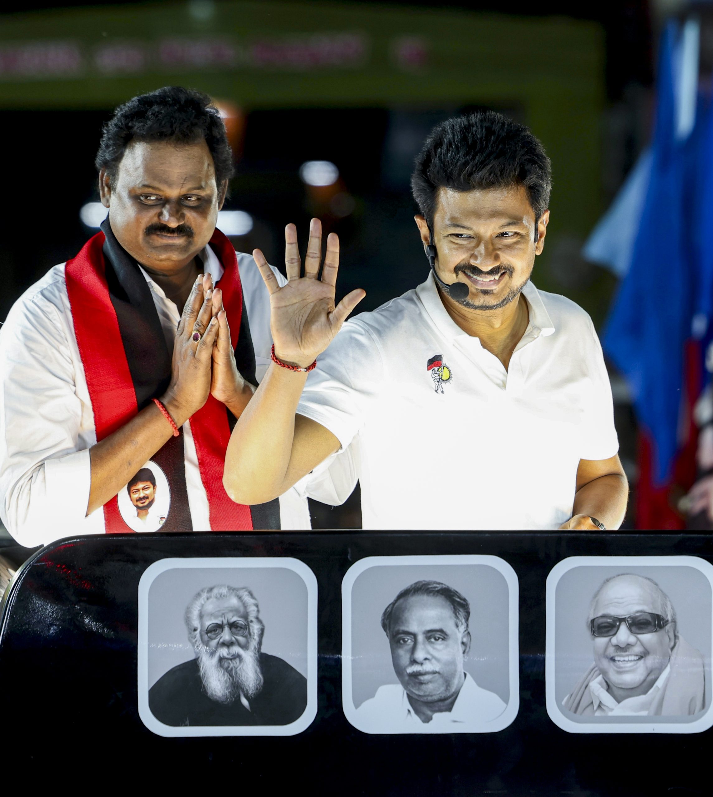 Tiruvannamalai: Tamil Nadu Deputy Chief Minister Udhayanidhi Stalin greets supporters during a roadshow in support of DMK candidate from Vandavasi constituency S Ambethkumar, ahead of the state Assembly elections, in Tiruvannamalai district, Monday, March 30, 2026. (PTI Photo) (PTI03_30_2026_000479B) *** Local Caption ***