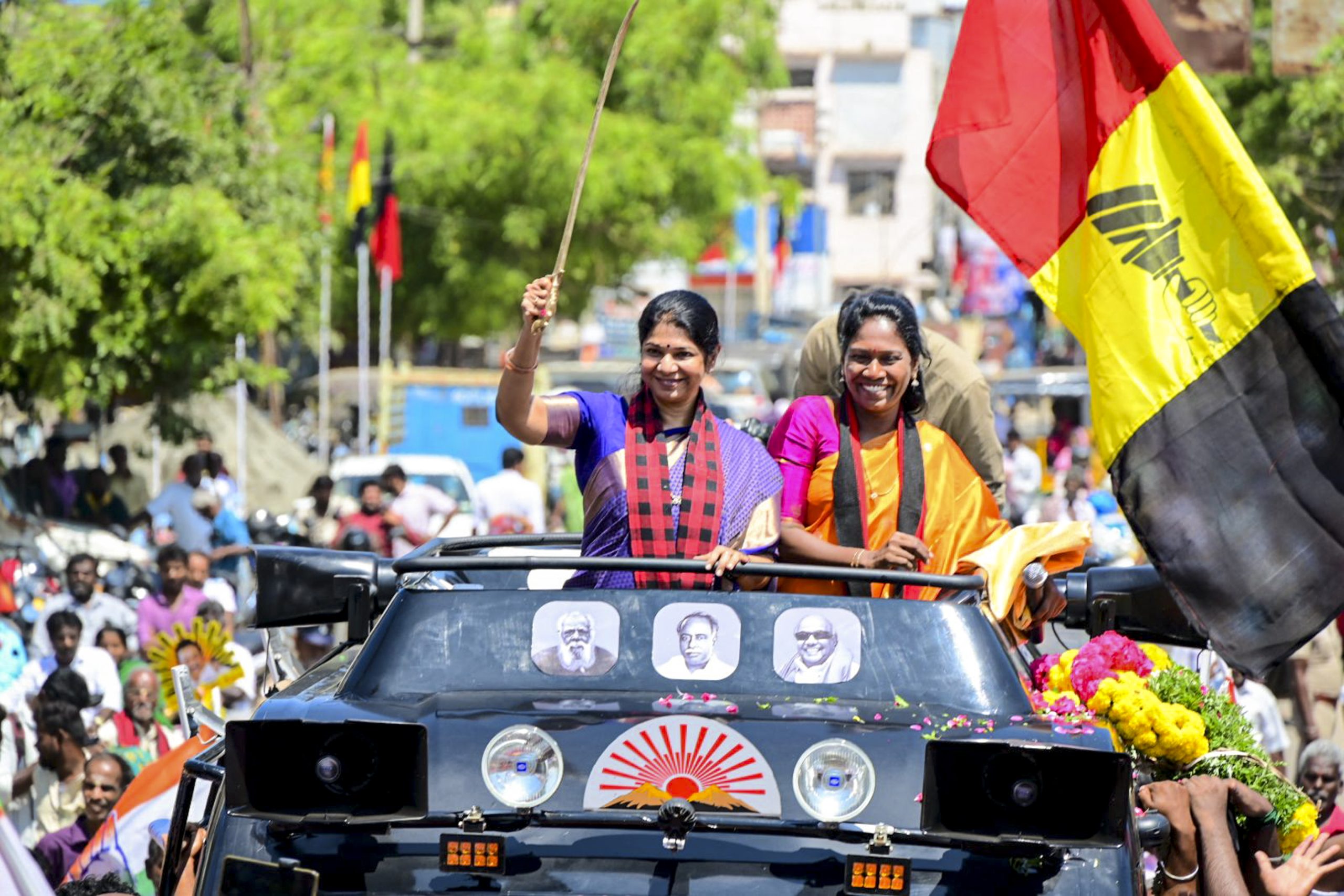 **EDS: THIRD PARTY IMAGE** In this image posted on April 2, 2026, DMK Deputy General Secretary and MP Kanimozhi Karunanidhi, left, greets the gathering during an election campaign in support of party candidate for Manamadurai constituency, A. Tamilarasi Ravikumar, right, ahead of Tamil Nadu Assembly Election, in Sivaganga district. (@KanimozhiDMK/X via PTI Photo)(PTI04_02_2026_000172B)