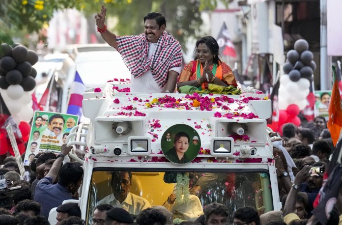 Chennai: Leader of Opposition in the Tamil Nadu Assembly and AIADMK chief Edappadi K Palaniswami with BJP leader and former Telangana governor Tamilisai Soundararajan during an election roadshow at the Mylapore constituency, ahead of the state Assembly elections, in Chennai district, Wednesday, March 25, 2026. (PTI Photo/R Senthilkumar) (PTI03_25_2026_000327B)
