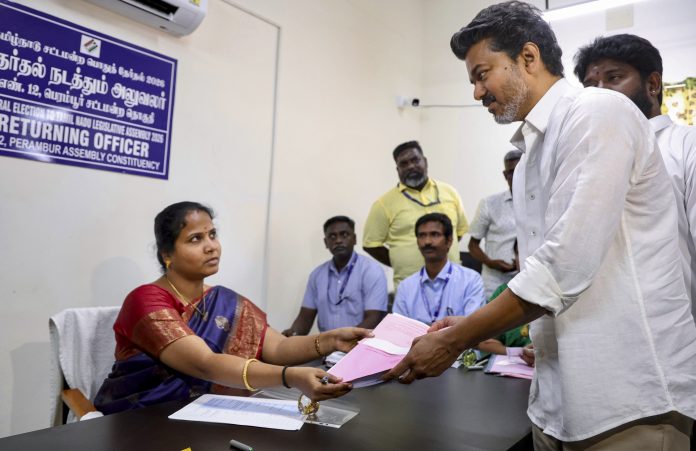 **EDS: THIRD PARTY IMAGE** In this image posted on March 30, 2026, Tamilaga Vettri Kazhagam (TVK) chief and actor Vijay files his nomination papers for the Tamil Nadu Assembly elections from the Perambur constituency at the Returning Officer’s office, in Chennai. (Handout via PTI Photo)(PTI03_30_2026_000185B)