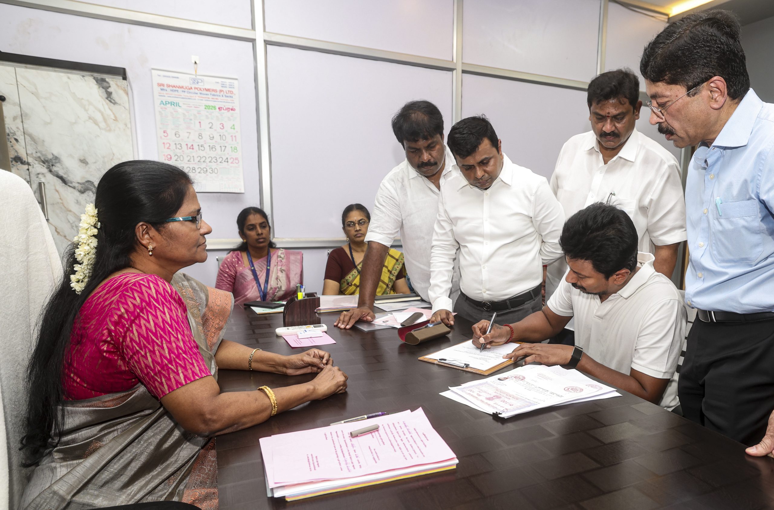 Chennai: Tamil Nadu Deputy Chief Minister and DMK Youth Wing Secretary Udhayanidhi Stalin files his nomination papers for the Tamil Nadu Assembly Election from the Chepauk-Thiruvallikeni constituency, at the Returning Officer’s office, in Chennai, April 2, 2026. (PTI Photo)(PTI04_02_2026_000095B)