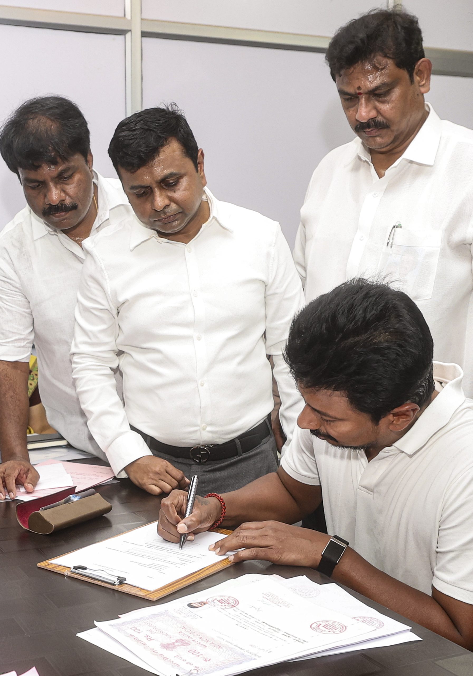 Chennai: Tamil Nadu Deputy Chief Minister and DMK Youth Wing Secretary Udhayanidhi Stalin files his nomination papers for the Tamil Nadu Assembly Election from the Chepauk-Thiruvallikeni constituency, at the Returning Officer’s office, in Chennai, April 2, 2026. (PTI Photo)(PTI04_02_2026_000096B)