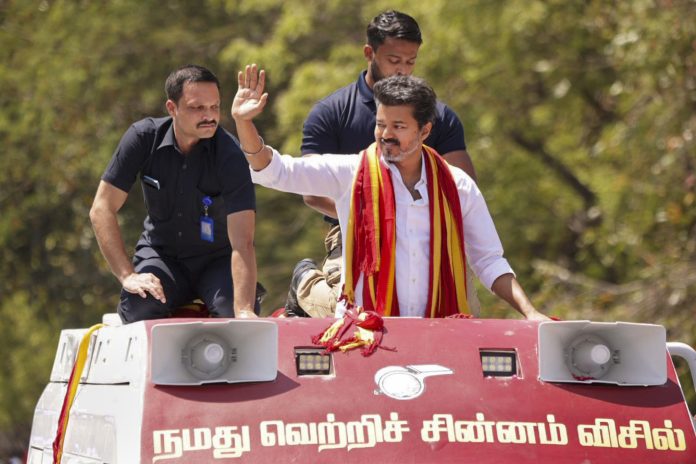 **EDS: THIRD PARTY IMAGE** In this image posted on April 2, 2026, Tamilaga Vettri Kazhagam (TVK) chief and candidate from the Tiruchirappalli East constituency, Vijay, during a roadshow en route to filing his nomination for Tamil Nadu Assembly elections, in Tiruchirappalli. (@TVKHQITWingOffl/X via PTI Photo) (PTI04_02_2026_000189B)