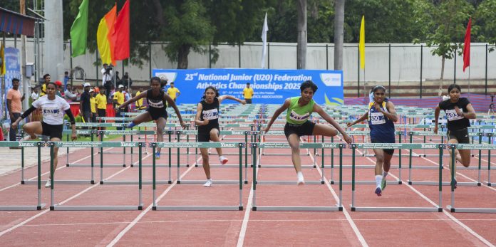 Prayagraj: Athletes compete in a race at the 23rd National Junior (U20) Federation Athletics Championships, in Prayagraj, Monday, June 23, 2025. (PTI Photo)(PTI06_23_2025_000216B)