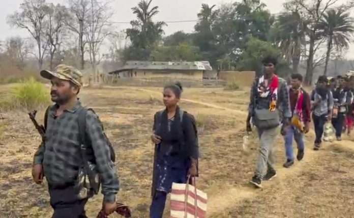Bijapur: Senior Maoist commander Papa Rao, a member of the Dandakaranaya Special Zonal Committee (DKSZC) and in-charge of south Sub Zonal Bureau of Maoists, with his team members after their surrender, in Bijapur district, Chhattisgarh, Tuesday, March 24, 2026. (PTI Photo) (PTI03_24_2026_000325B)