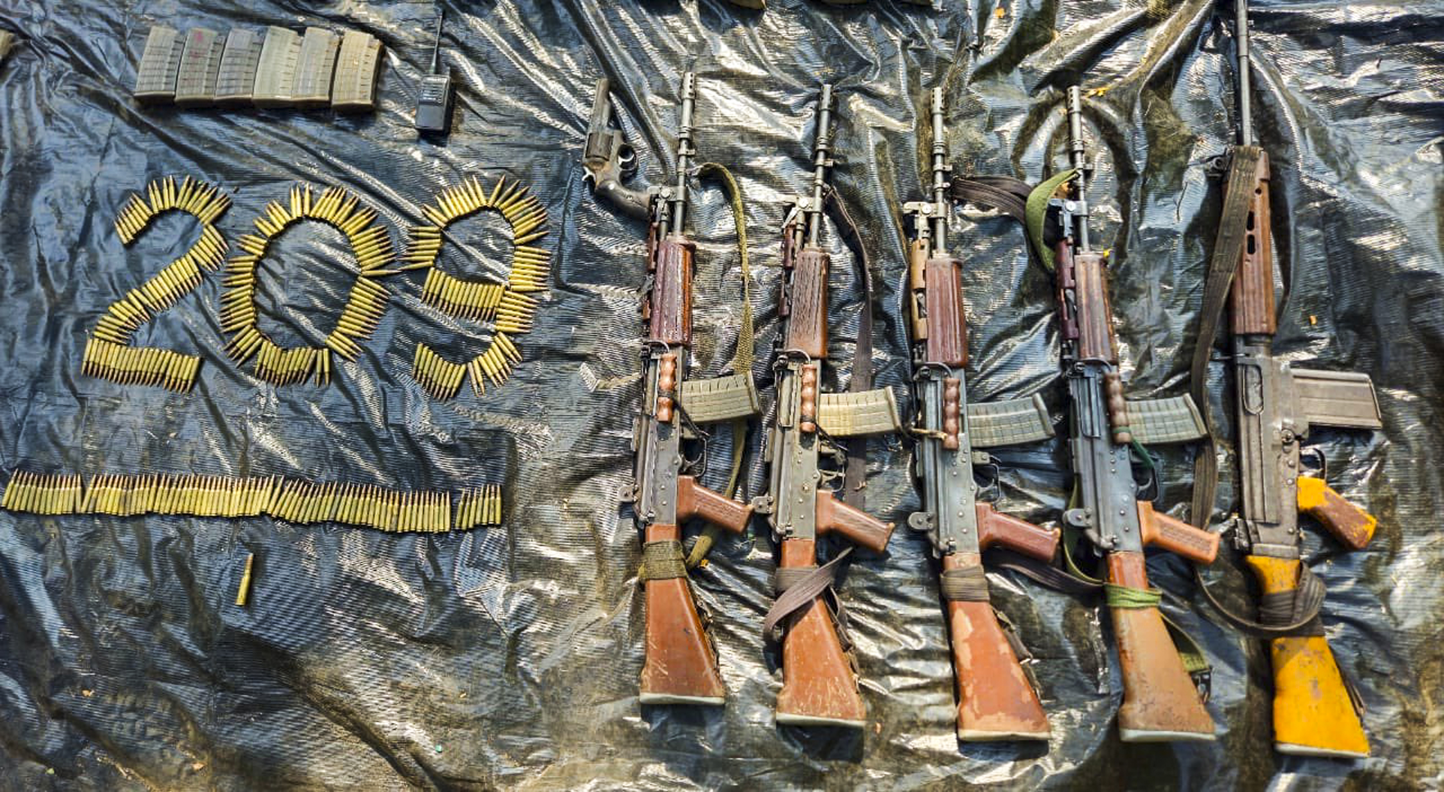 **EDS: THIRD PARTY** Bokaro: In this image posted by @gpsinghips via X on April 21, 2025, recovered arms and ammunition after an encounter between security personnel and left-wing extremists, in which at least eight Maoists were killed, at Luguburu forest range in Bokaro district, Monday, April 21, 2025. (PTI Photo) (PTI04_21_2025_000343B) *** Local Caption ***
