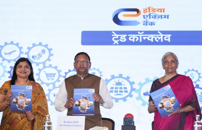 New Delhi: Union Finance Minister Nirmala Sitharaman with Minister of State for Finance Pankaj Chaudhary and India Exim Bank Managing Director Harsha Bangari releases a publication during the India Exim Bank Trade Conclave 2025, in New Delhi, Tuesday, June 24, 2025. (PTI Photo/Kamal Kishore) (PTI06_24_2025_000085B)