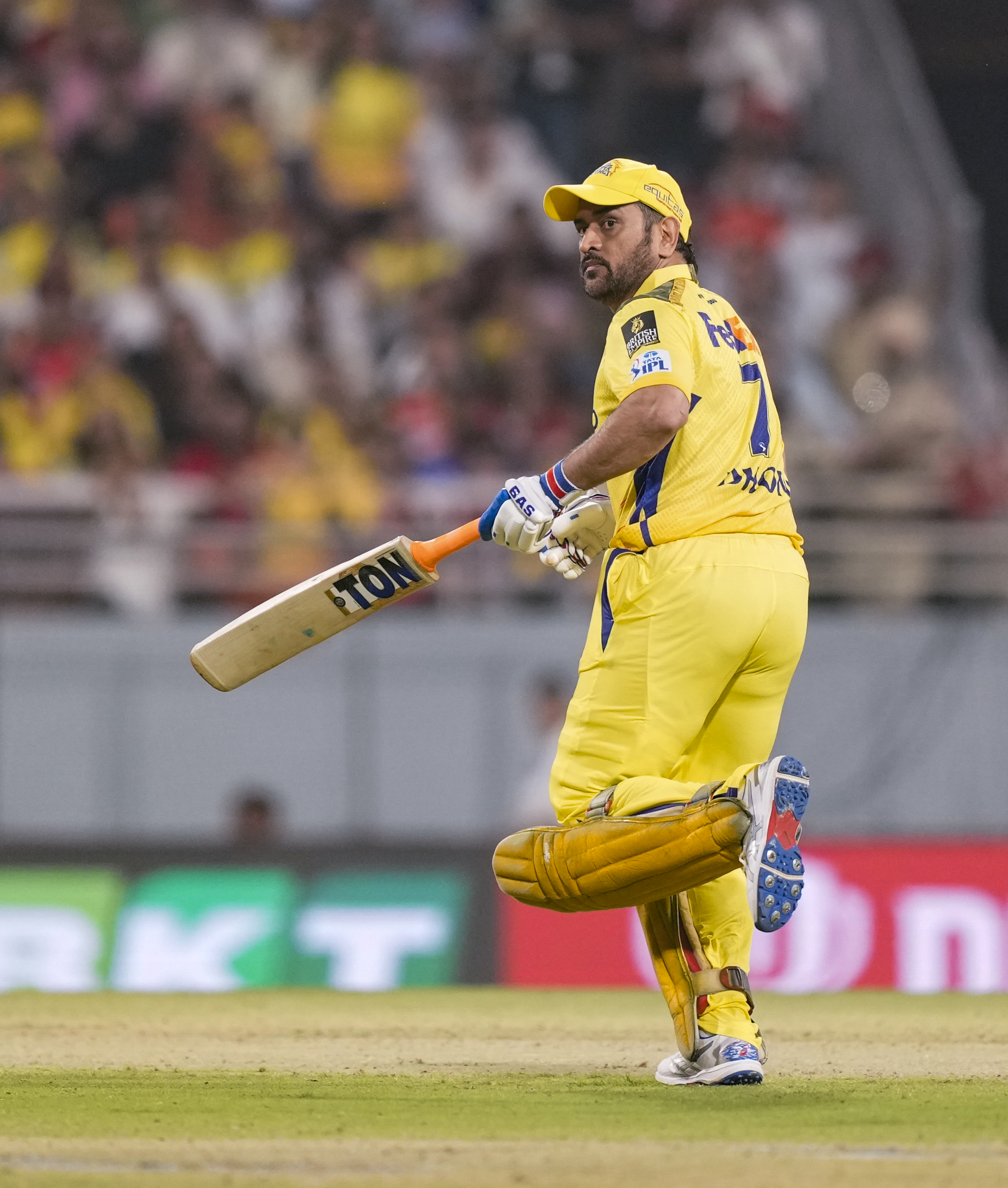 New Chandigarh: Chennai Super Kings' M S Dhoni plays a shot during an Indian Premier League (IPL) 2025 cricket match between Punjab Kings and Chennai Super Kings, in New Chandigarh, Tuesday, April 8, 2025. (PTI Photo/Ravi Choudhary) (PTI04_08_2025_000682B)