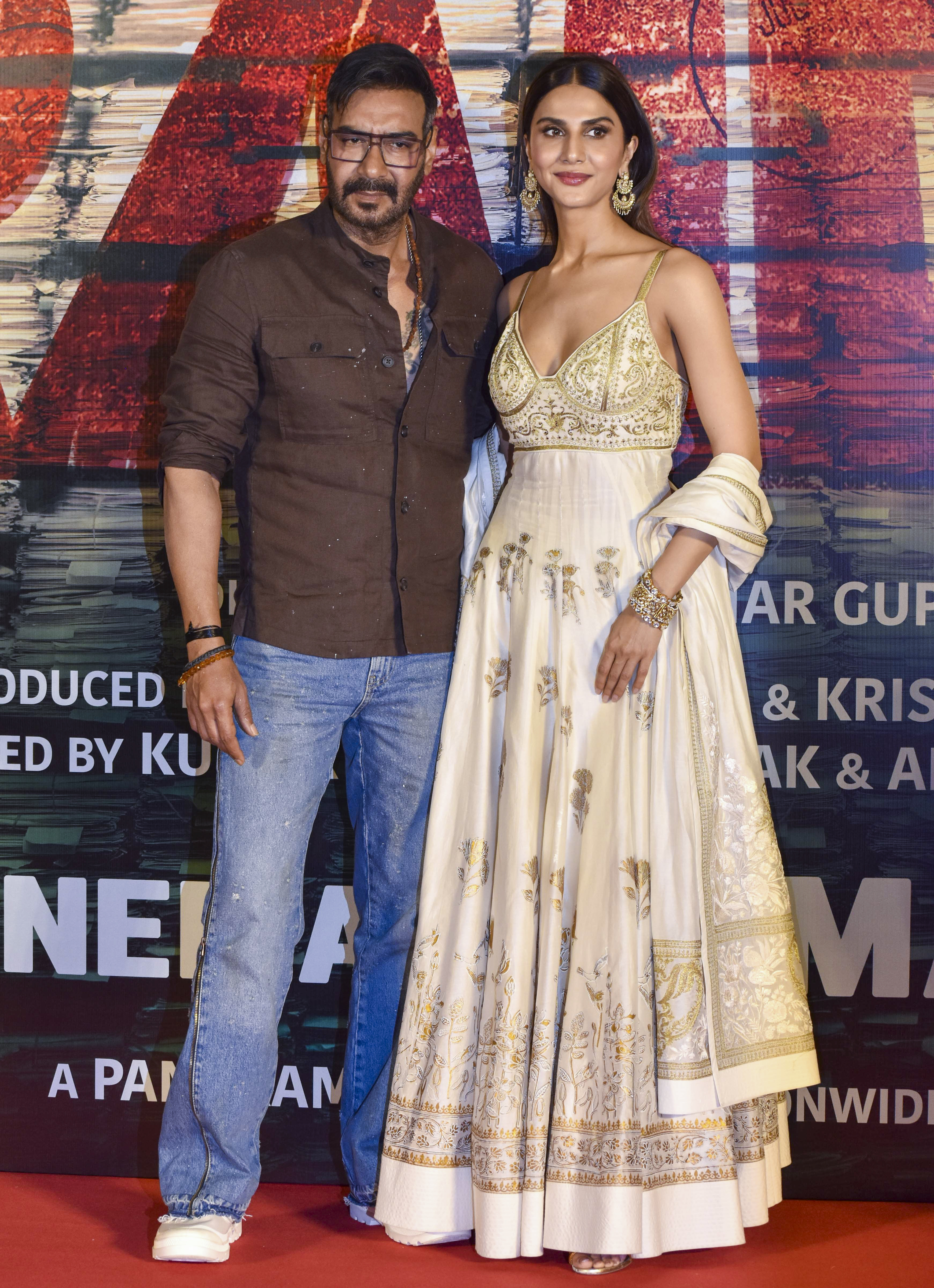 Mumbai : Bollywood actors Ajay Devgn and Vaani Kapoor pose for pictures during the trailer launch of the upcoming film ‘Raid 2’, in Mumbai, Tuesday, April 8, 2025. (PTI Photo)(PTI04_08_2025_000321B)