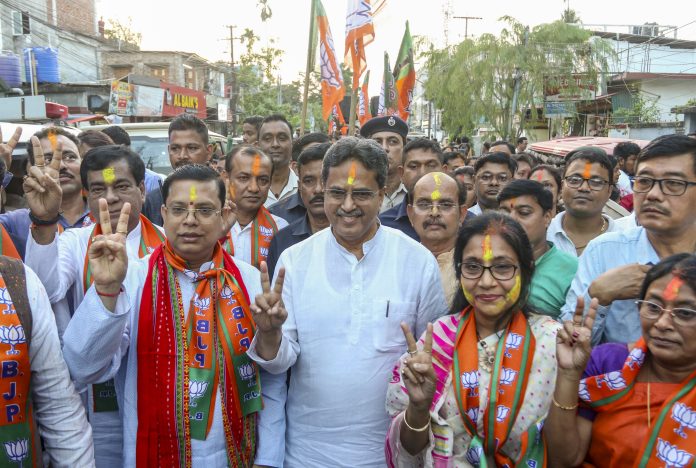 Agartala: Tripura Chief Minister Manik Saha, center, and others show victory signs as they celebrate the NDA’s win in the Bihar Assembly elections, in Agartala, Friday, Nov. 14, 2025. (PTI Photo) (PTI11_14_2025_000303B)