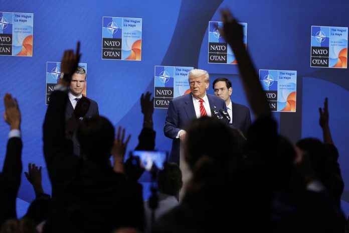 Journalists raise their hands to ask questions as President Donald Trump, center, addresses a media conference at the NATO summit in The Hague, Netherlands, Wednesday, June 25, 2025. AP/PTI(AP06_25_2025_000317B)