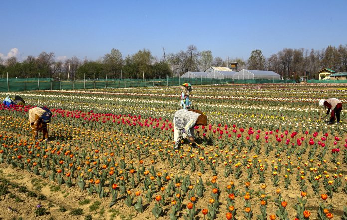 Pulwama: Workers plough the field as the Indigenize Tulip Bulb production is in full bloom under the CSIR Floriculture Mission at CSIR-IIIM Fields Station, at Bonoora, in Pulwama, Jammu and Kashmir, Friday, March 27, 2026. (PTI Photo)(PTI03_27_2026_000150B)