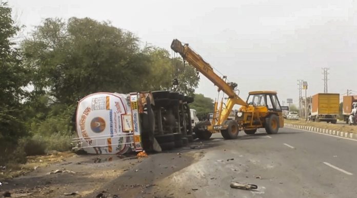 **EDS: SCREENCRAB VIA PTI VIDEOS** Hisar: A crane lifts the oil tanker that overturned on a bike killing a man and his wife at Raipur Chowk, in Hisar, Friday, Apr. 11, 2025. (PTI Photo)(PTI04_11_2025_000079B)