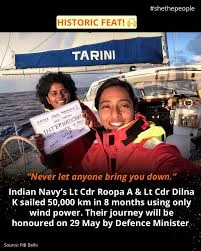 The duo, with back-up support from the Navy, covered more than 25,600 nautical miles in 238 days in INSV Tarini, their sailing boat. It was the first circumnavigation of the globe in a sailing vessel by Indian women in `double-handed’ mode, said a Navy spokesperson.