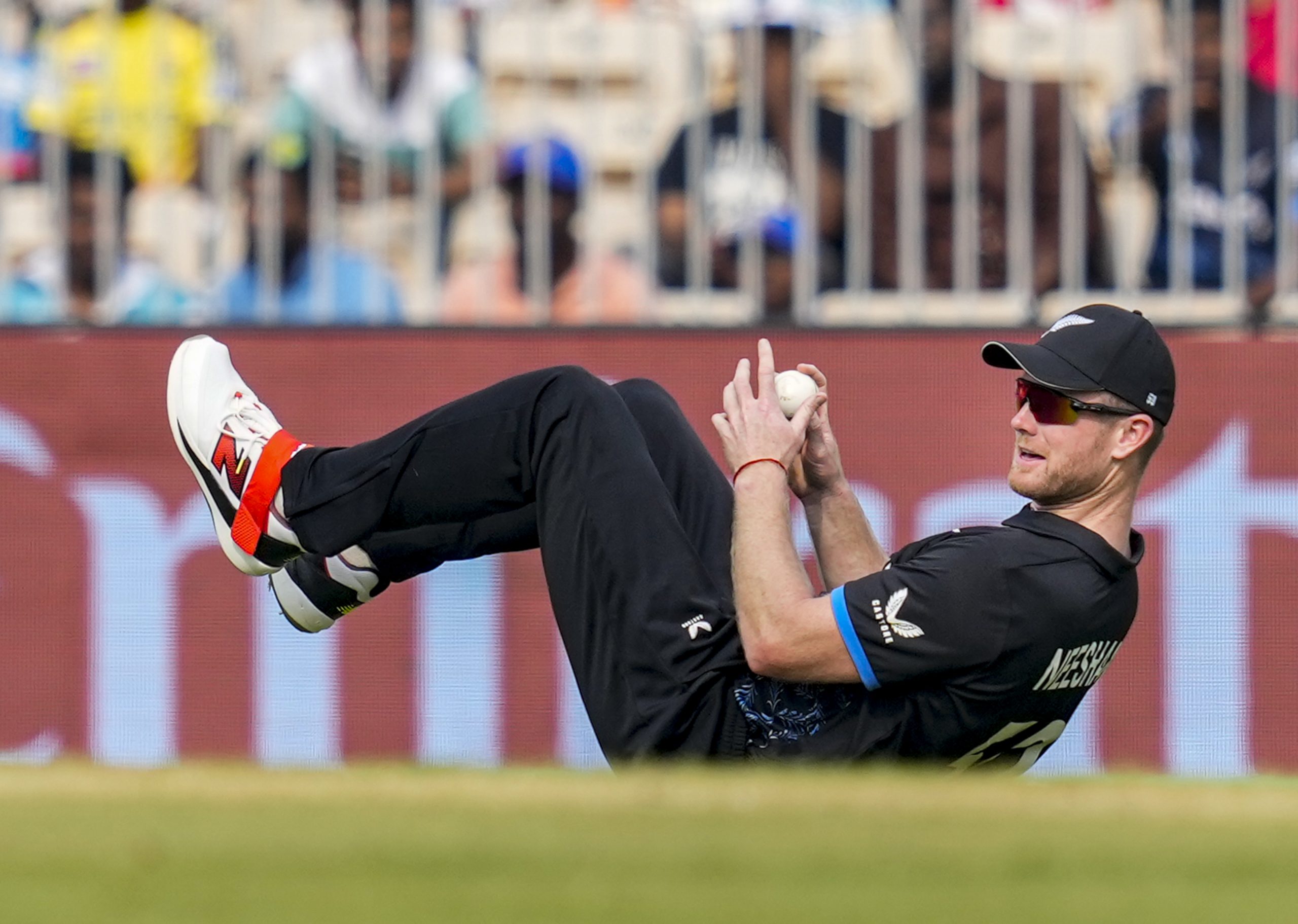 Chennai: New Zealand's James Neesham fields the ball during the ICC Men's T20 World Cup 2026 cricket match between New Zealand and United Arab Emirates at the MA Chidambaram Stadium, in Chennai, Tuesday, Feb. 10, 2026. (PTI Photo/R SenthilKumar)(PTI02_10_2026_000195B)