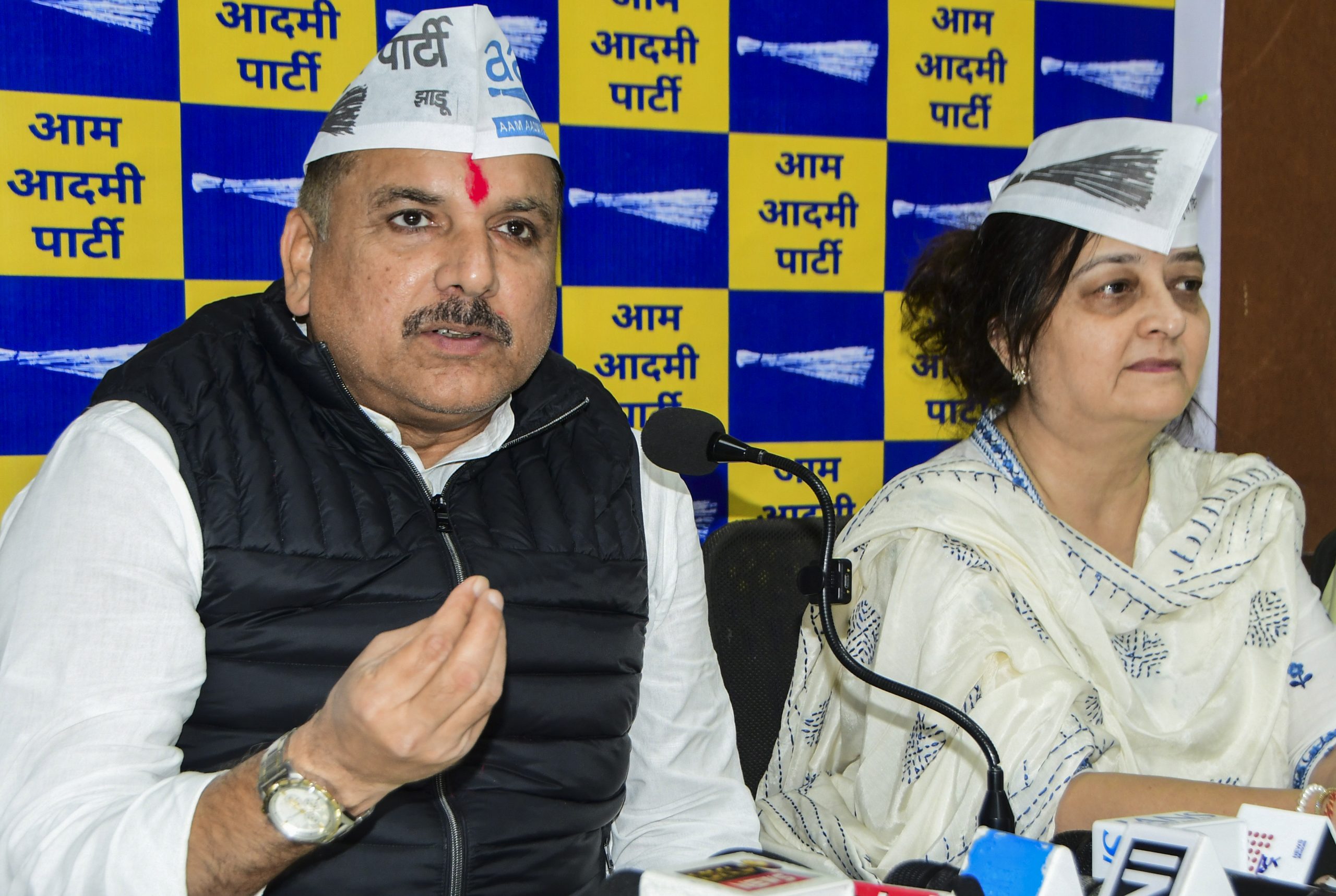 Mumbai: AAP MP Sanjay Singh, left, addresses the media regarding the Maharashtra municipal corporation elections, in Mumbai, Friday, Dec. 19, 2025. (PTI Photo)(PTI12_19_2025_000481B)