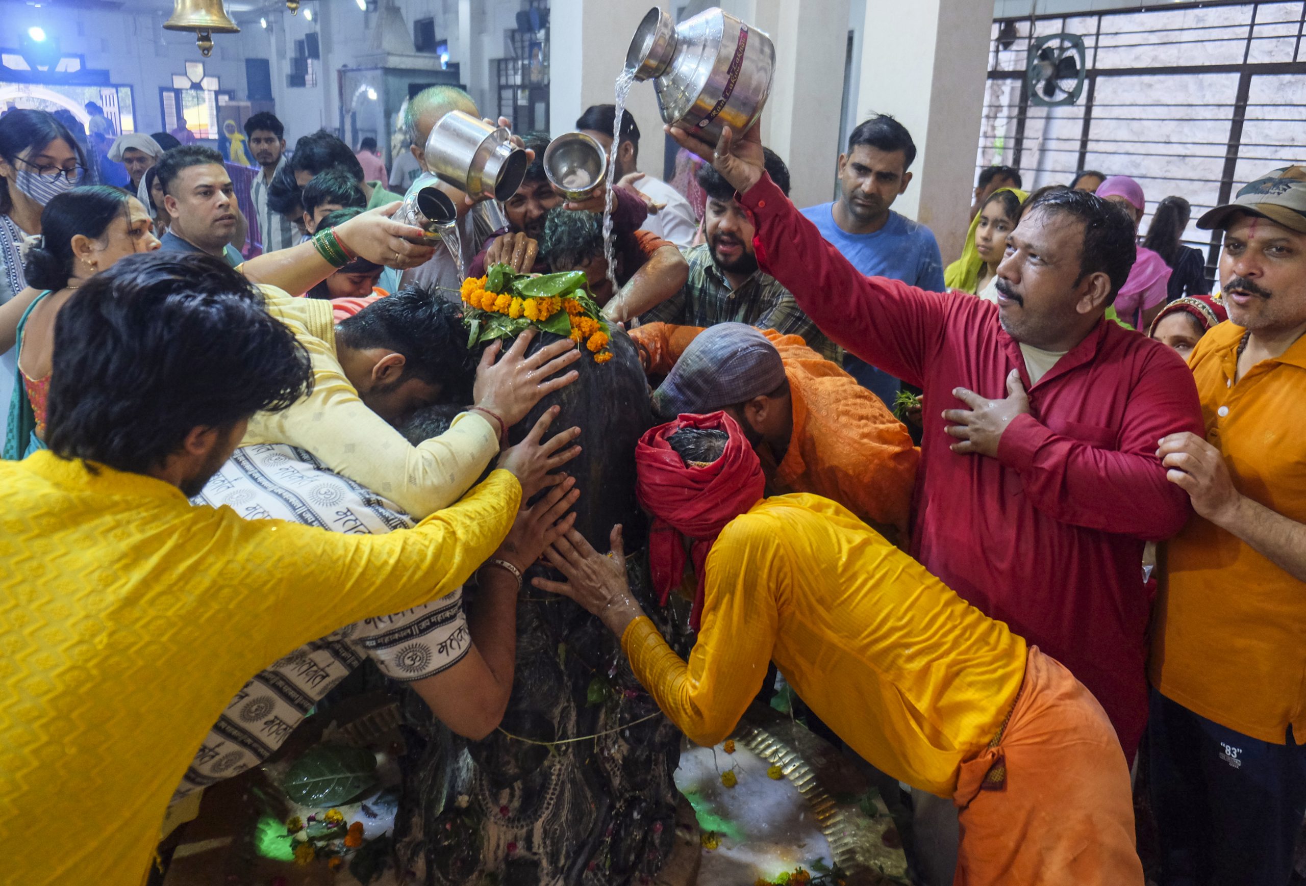 Gurugram: Devotees perform 'abhishek' of a 'shivling' on the occasion of 'sawan shivratri' festival, in Gurugram, Wednesday, July 23, 2025. (PTI Photo) (PTI07_23_2025_000098B)