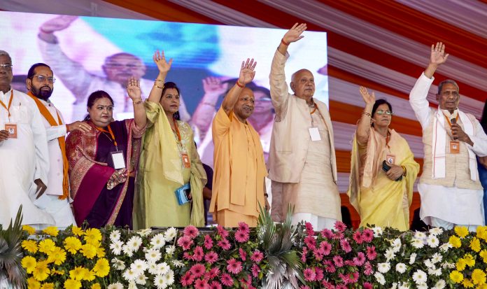 **EDS: THIRD PARTY IMAGE** In this image posted on March 25, 2026, Uttar Pradesh Chief Minister Yogi Adityanath, centre, greets the gathering with others during the distribution programme of CM�s Housing units, toilets and land leases to 136 families, in Bahraich, Uttar Pradesh. (@myogiadityanath/X via PTI Photo)(PTI03_25_2026_000283B)